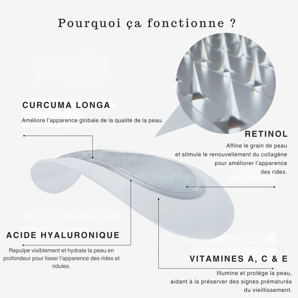 Parce que les crèmes restent en surface. Nos patchs vont en profondeur. Chaque patch contient des centaines de micro-cônes dissolvants invisibles à l'œil nu, totalement indolores composés à 100% d'acide hyaluronique pur et de peptides actifs.